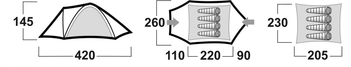 | Felépítés | kétrétegű, önhordó sátor külső szerkezettel. |