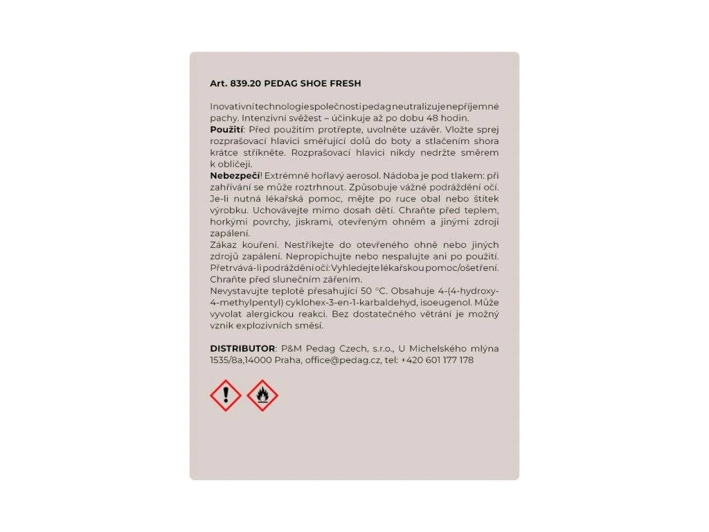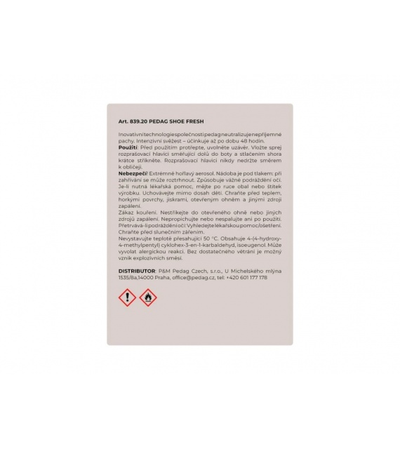 A pedag Shoe Fresh cipődezodor véget vet a kellemetlen szagoknak a sportcipőkben. Az erőteljes, fejjel lefelé is működő szórófejjel ellátott, hosszú távú hatású spray érezhető frissességet biztosít 48 órán keresztül. A két szórófejnek köszönhetően a cipődezodor nagyon hatékony és gazdaságos: egyszerre szórja a cipő elejét és hátulját. A használata rendkívül egyszerű: lazítsd meg a kupakot, helyezd a sportcipőbe fejjel lefelé, nyomd meg, és egyetlen permetezés elegendő.