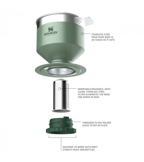 Szétszedhetõ, tartós szûrõ többszöri használatra. Nemcsak a környezetet védi, hanem a pénztárcádat is kíméli. Átgondolt kialakításának köszönhetõen nemcsak a STANLEY CAMP bögre tetejére illik, hanem bármely STANLEY CLASSIC termoszra is. Használat után egyszerûen átöblíthetõ vagy mosogatógépben elmosható.